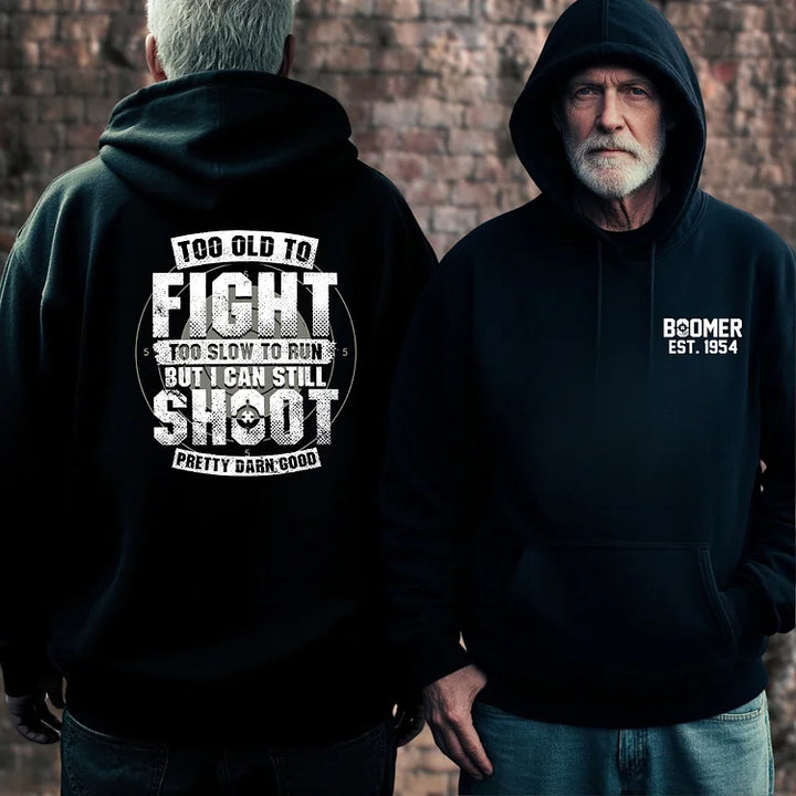 - Personalized Design: Customize with your year of birth, creating a one-of-a-kind hoodie that celebrates your place in the Baby Boomer legacy. The bold message “Too Old To Fight, Too Slow To Run, But I Can Still Shoot Pretty Darn Good” adds a humorous and confident touch.