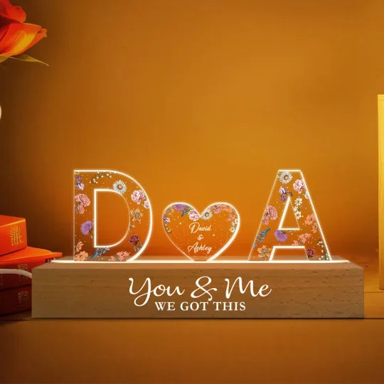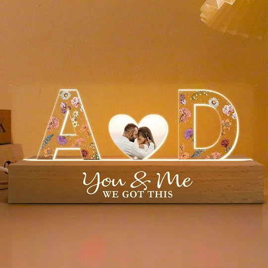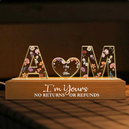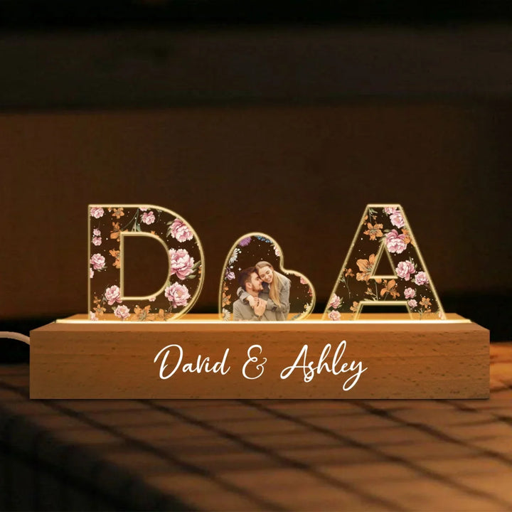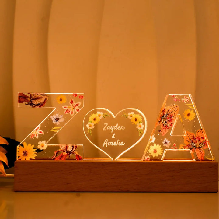 Couple Initials Floral Theme Anniversary Gift Personalized Acrylic Block LED Night Light