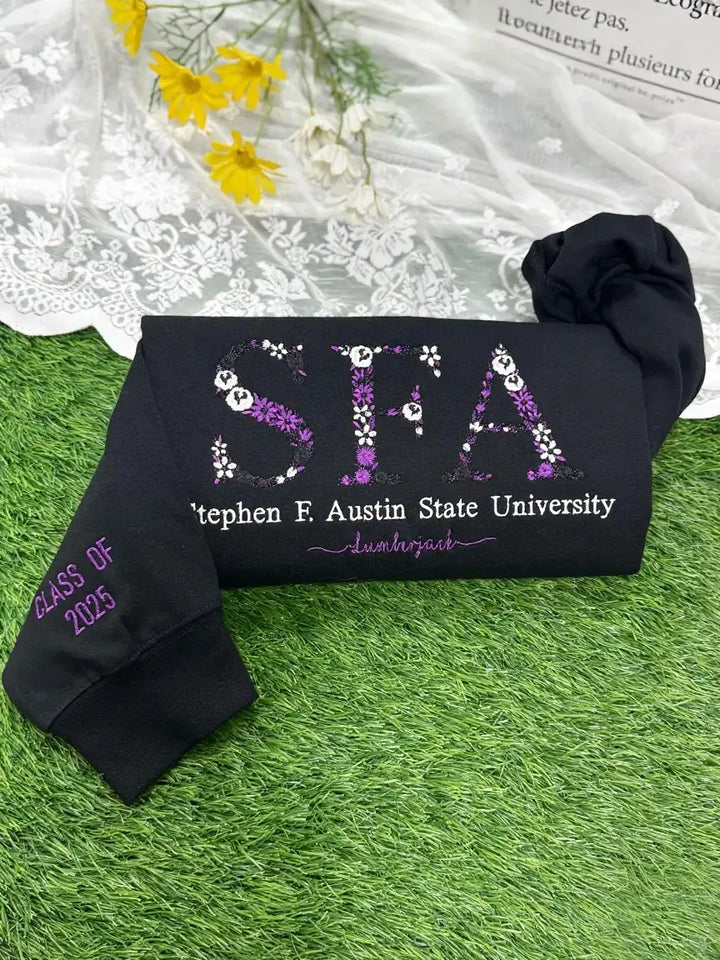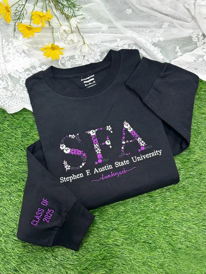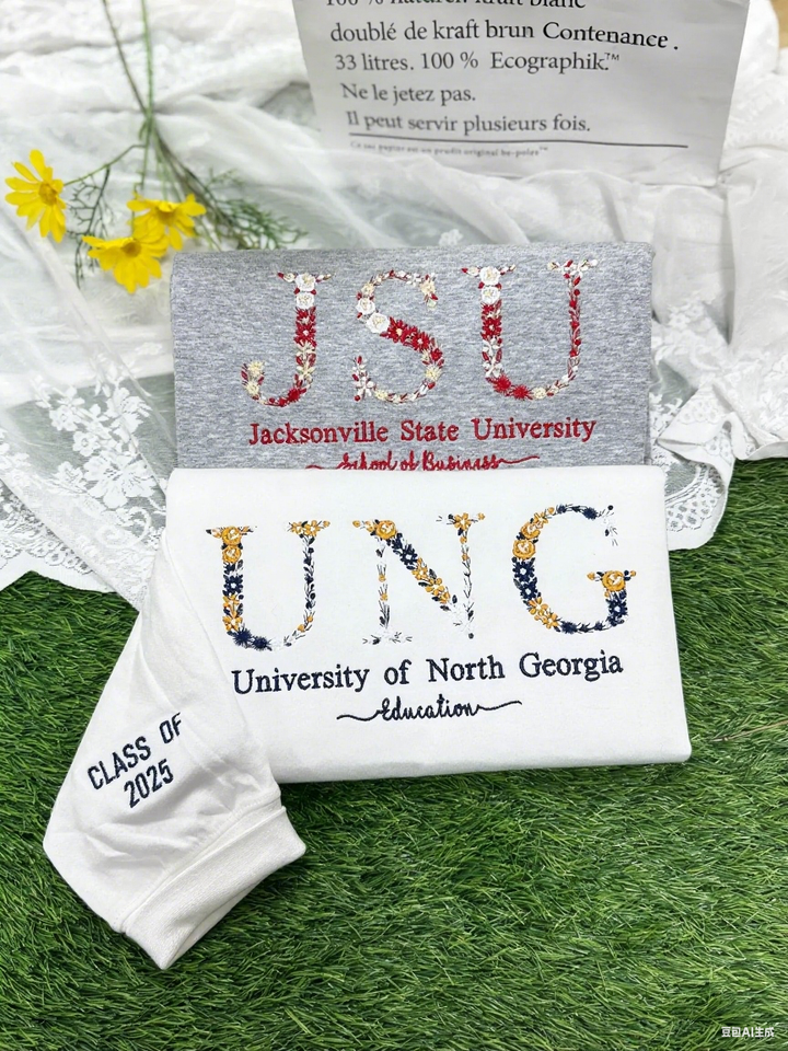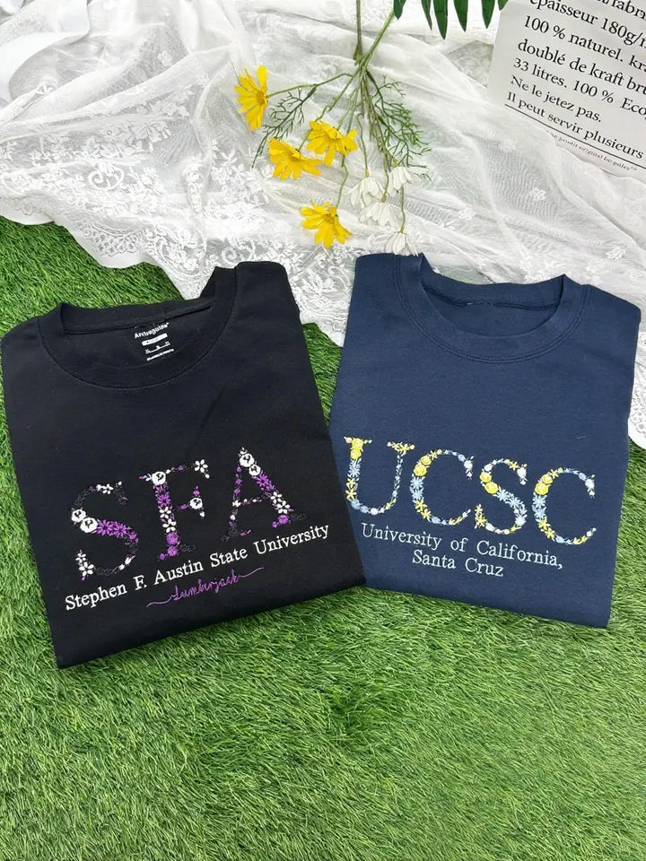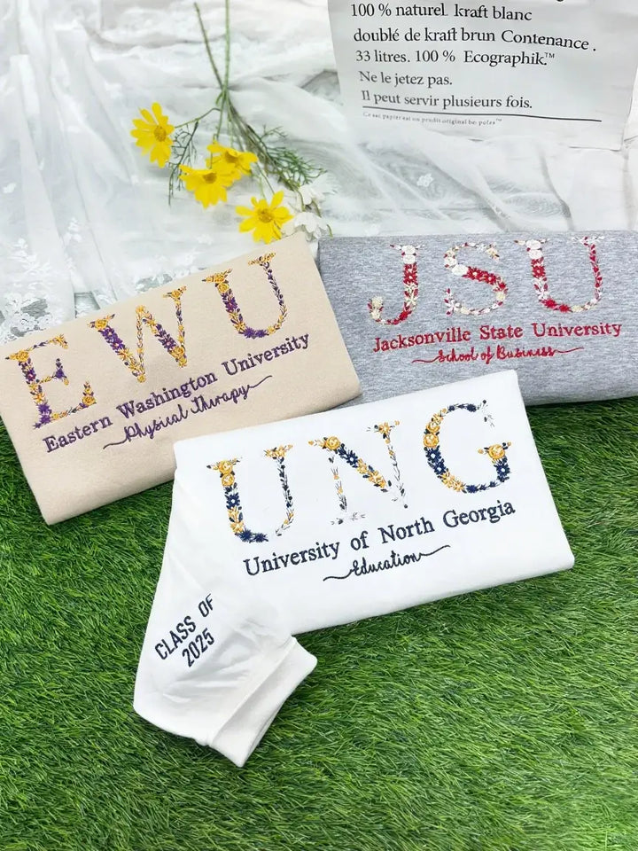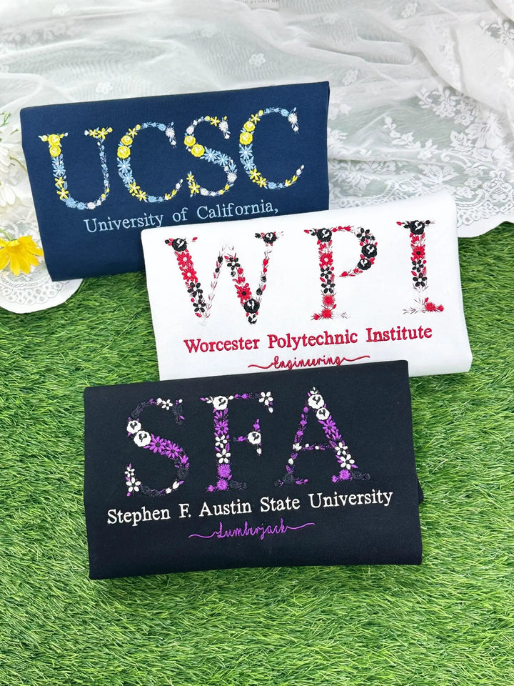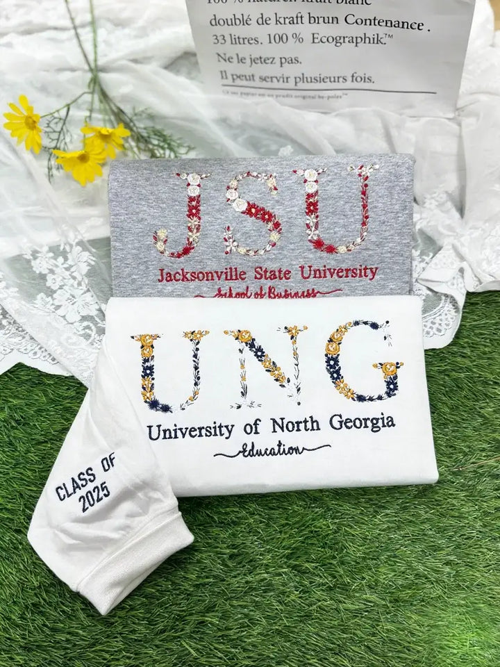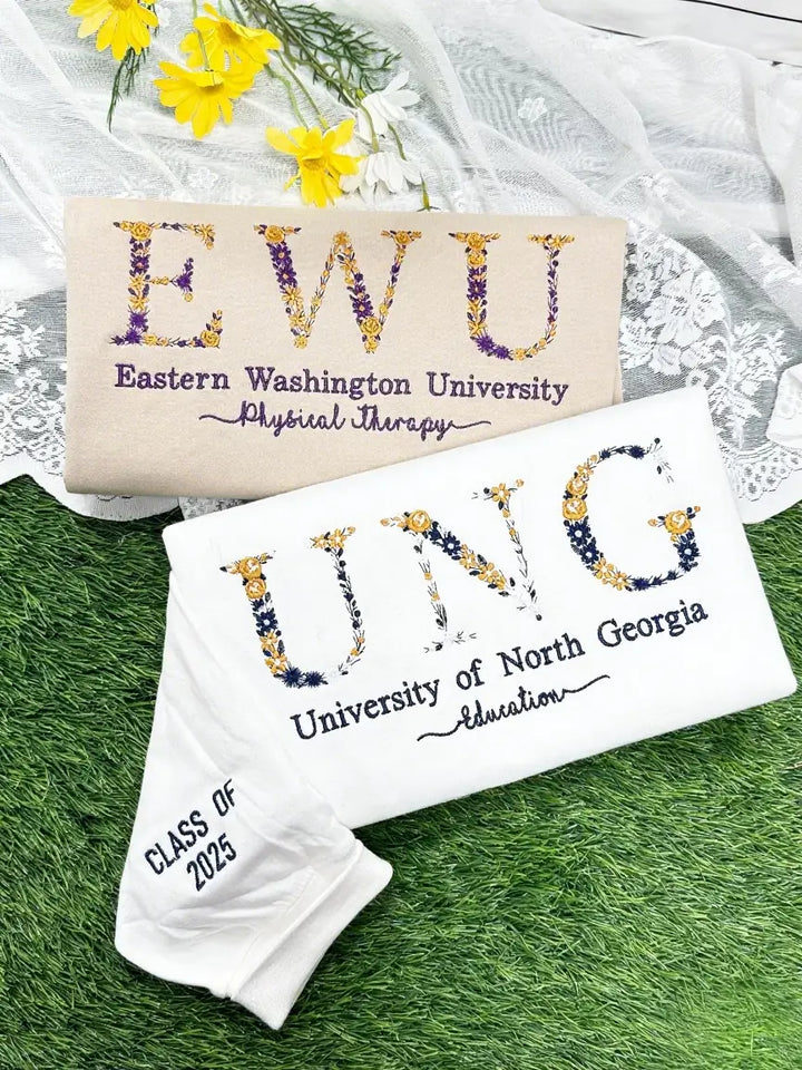 Show off your school pride in style with our Custom College Floral Letter Embroidered Sweatshirt. This cozy and fashionable sweatshirt combines the timeless appeal of floral embroidery with the bold spirit of your college, making it a must-have for students, alumni, and fans alike.