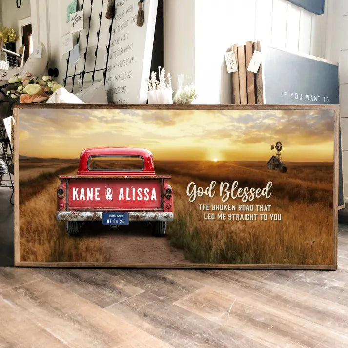 Celebrate your love story with this stunning, personalized wall art featuring a rustic red truck driving into a breathtaking sunset. The canvas is customized with your names and an “Established” date on the license plate, symbolizing the start of your beautiful journey together.