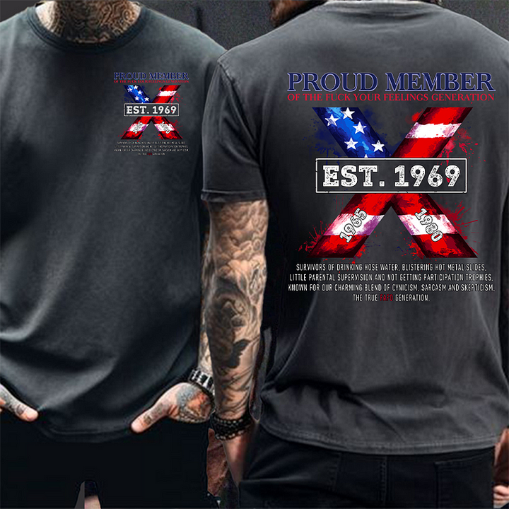Introducing our Custom Year FAFO Proud Member Gen X 2-Side T-Shirt! Celebrate your Generation X pride with this unique, double-sided shirt. Featuring bold "Proud Member" text and a stylish flag design, this shirt is perfect for showcasing your generational spirit.