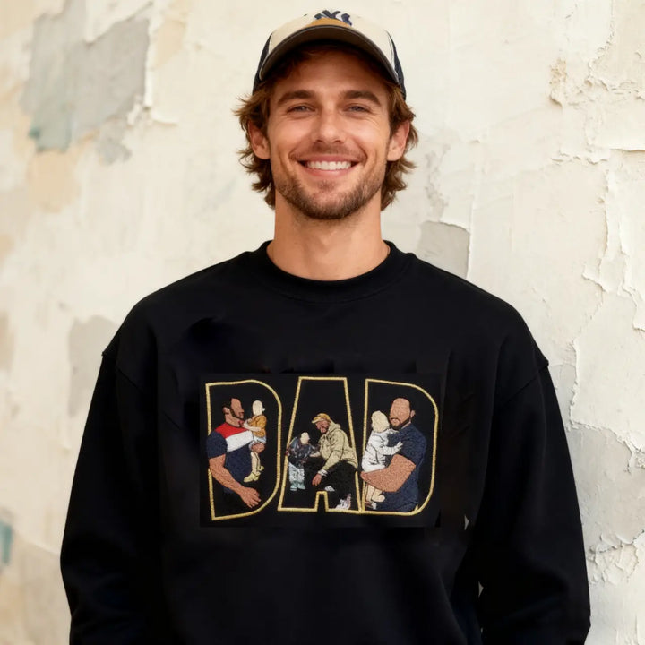 Celebrate the special bond between a father and his children with this custom embroidered sweatshirt. Featuring the word "DAD" filled with beautifully stitched illustrations based on your own family photos, this sweatshirt makes a heartfelt gift for Father's Day, birthdays, or any occasion.Ā