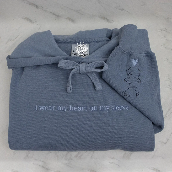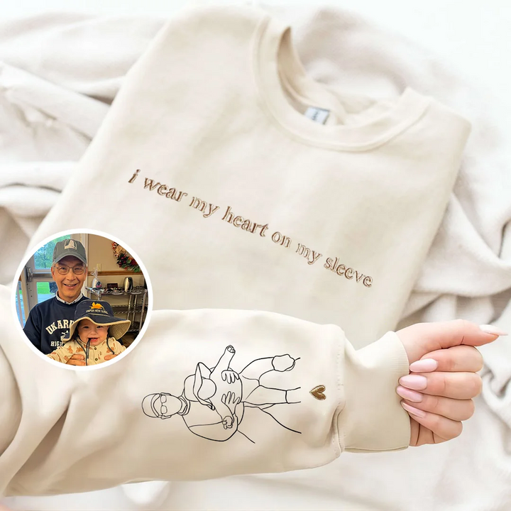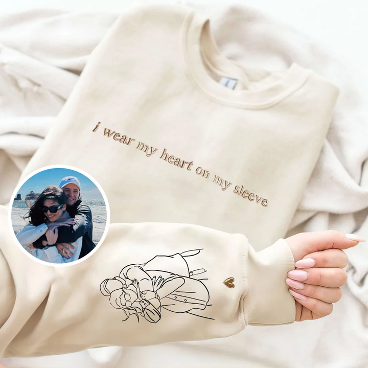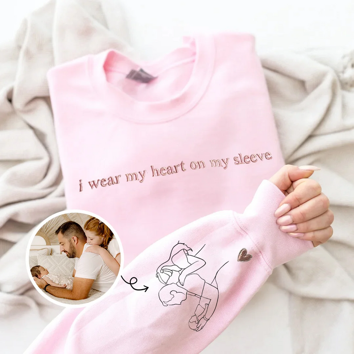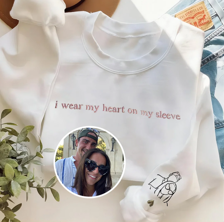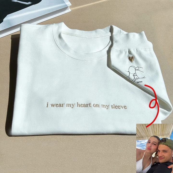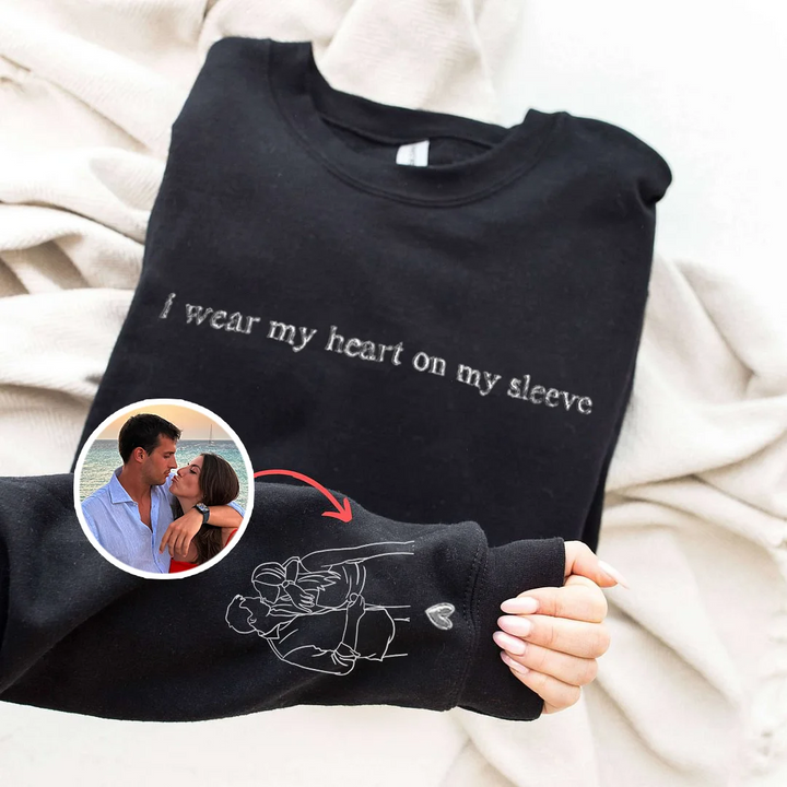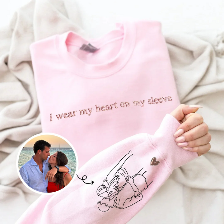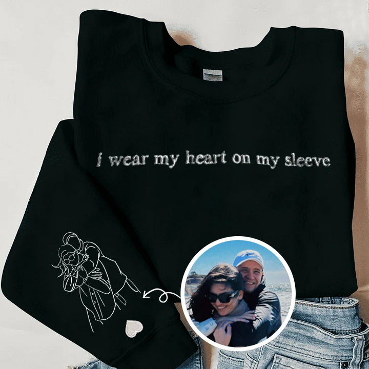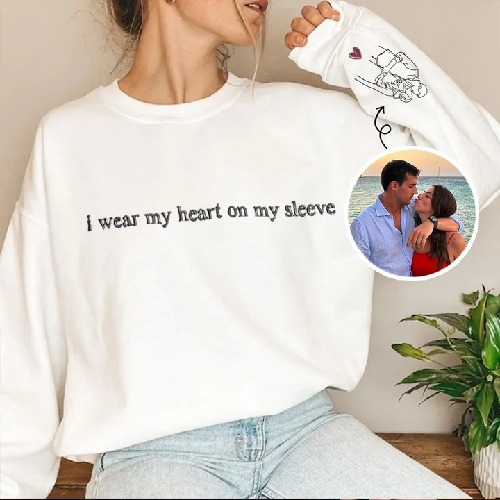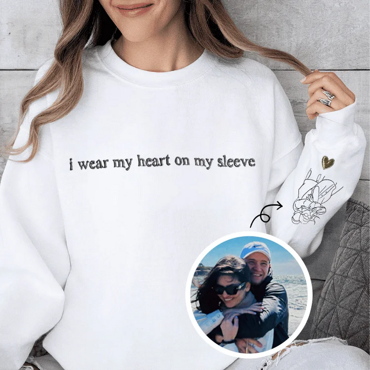 The front of the sweatshirt/t-shirt features the phrase "I Wear My Heart on My Sleeve" crafted with intricate embroidery. The sleeve design is created using a high-quality heat transfer technique. Upload your photo to customize the sleeve design and make this garment uniquely yours.
