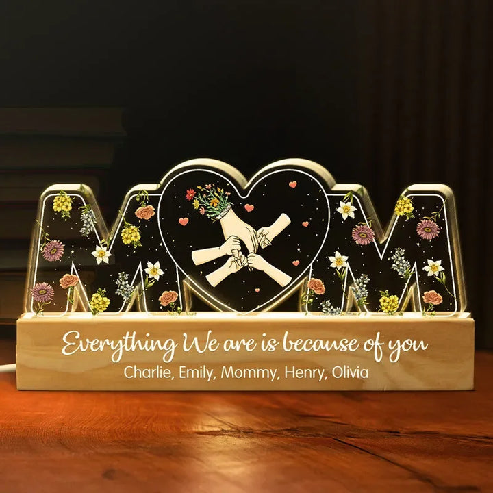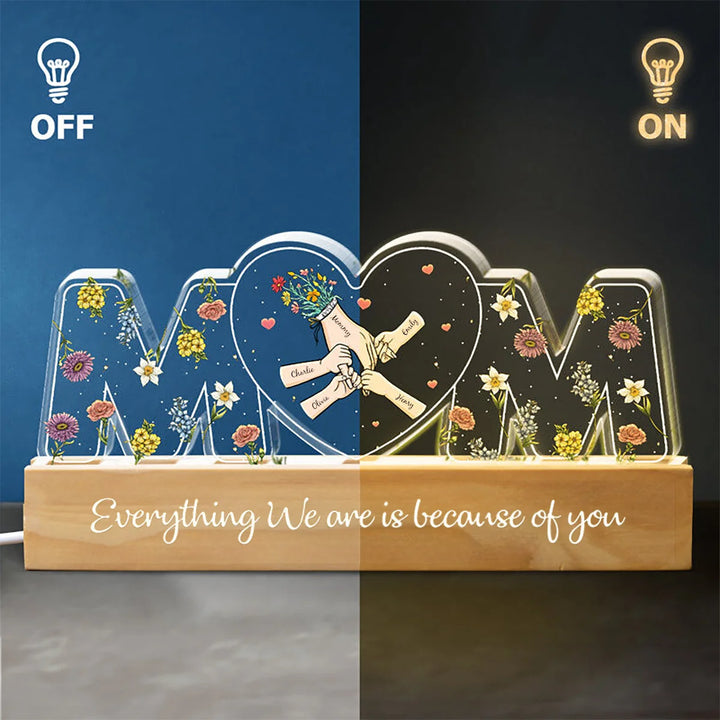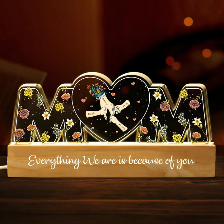 Mom Holds Kids Hands Everything We Are Is Because Of You - Personalized 3D LED Light Wooden Base - Gift For Mom