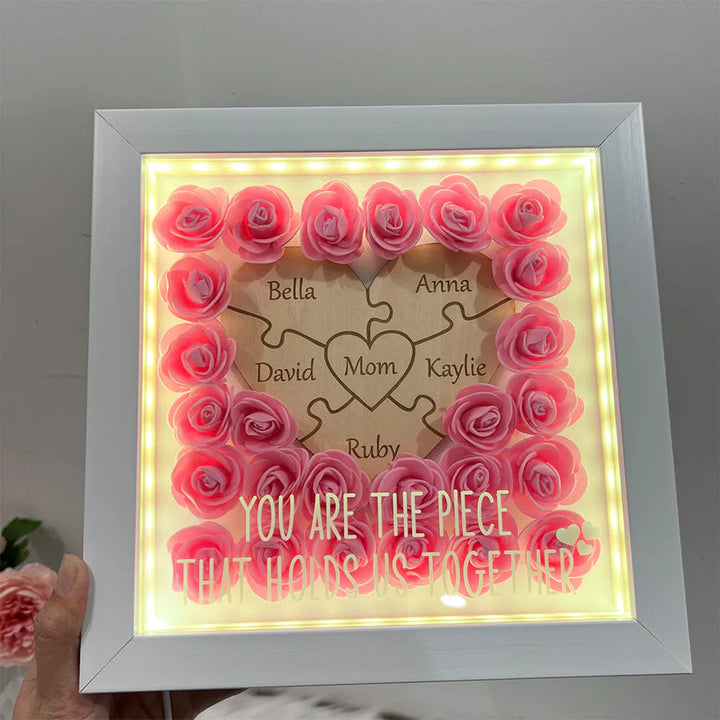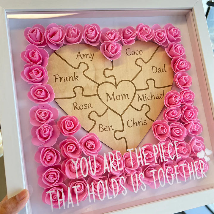 Show Mom just how much she means to you with this Custom Heart-Shaped Puzzle Piece Flower Shadow Box with LED Light. Designed to symbolize the unbreakable bond between a mother and her loved ones, this heartfelt piece is the perfect Mother's Day gift or keepsake for any special occasion.