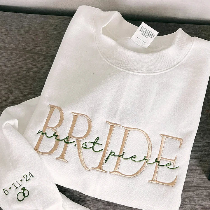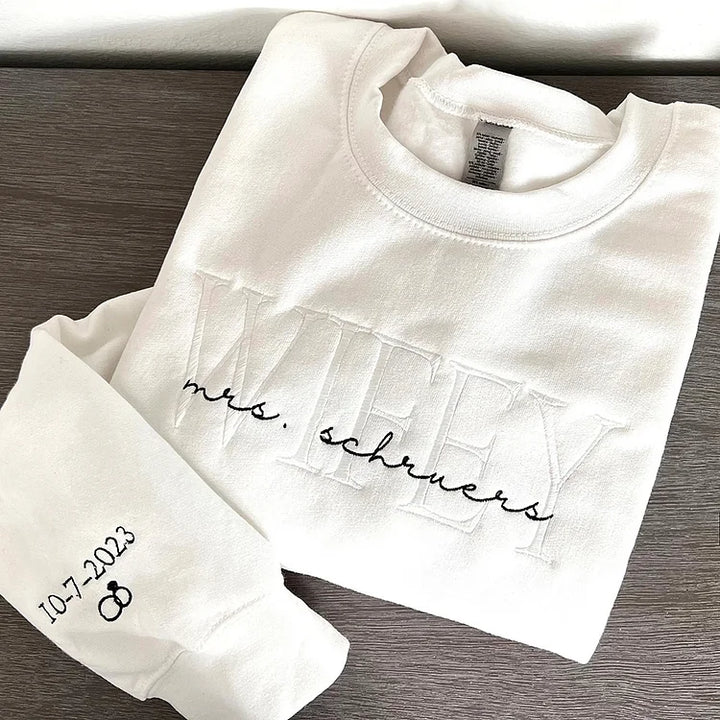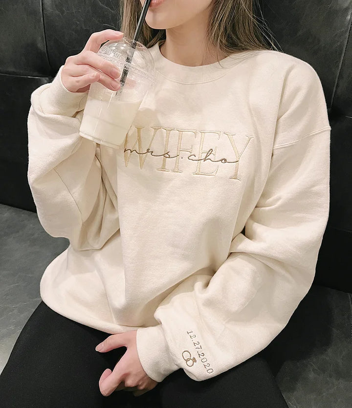 Personalized Wifey Bride Embroidered Sweatshirt With Date On Sleeve
