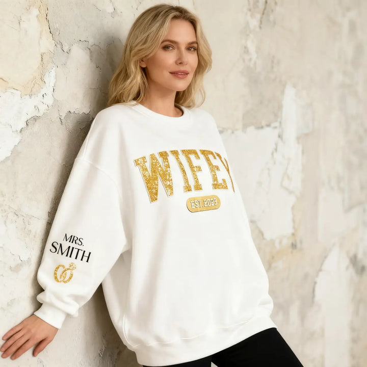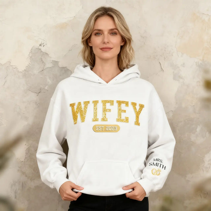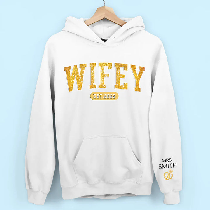 Wifey Est - Couple Personalized Custom Unisex Sweatshirt With Design On Sleeve - Gift For Husband Wife, Anniversary